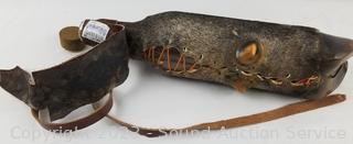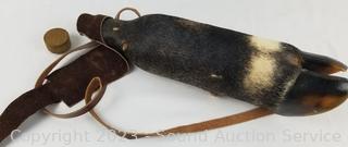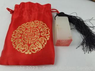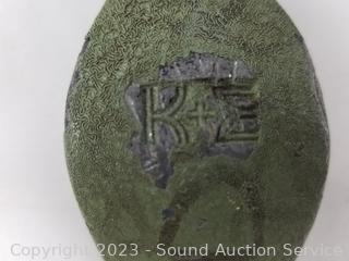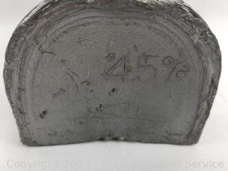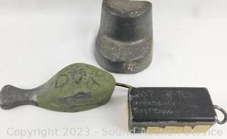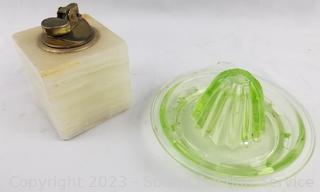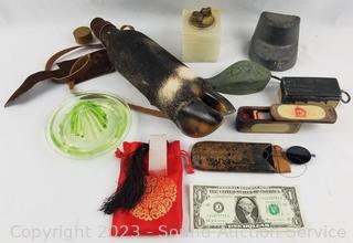 Lot Details: Pig foot wrapped bottle, uranium glass juicer, quartz stone table lighter, Asian acrylic & stone stamps, 6lb 4oz, 3lb 4oz, & 3lb 7oz chunks of lead, vtg. sunglasses.