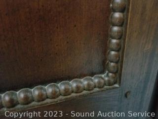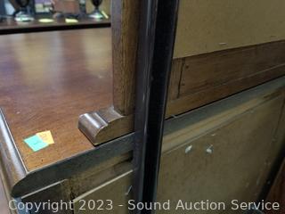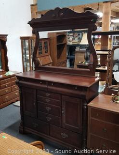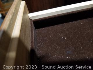 Lot Details: 2 low profile jewelry drawers, velvet lined. 2 Cabinets & 6 other drawers. Wood fronts, particle board construction with veneer finish. 45.5" H x 54" W x 19" D with 42" H x 51" mirror topper. Matches the next lot.