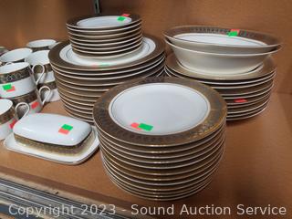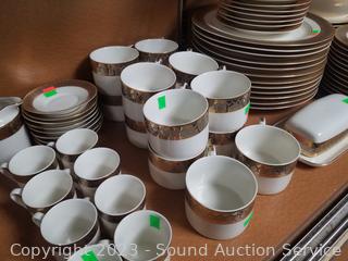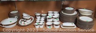 Lot Details: 12 dinner plates, 10 soup bowls, 12 lunch plates, 14 cups w/14 saucers, 8 demitasse cups with 8 saucers, creamer, butter dish, gravy boat, salt & pepper shakers, 2 9" serving bowls, 8" covered server, 14" platter. Some wear from use, faded trim, crazing, etc.
