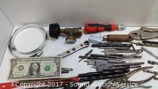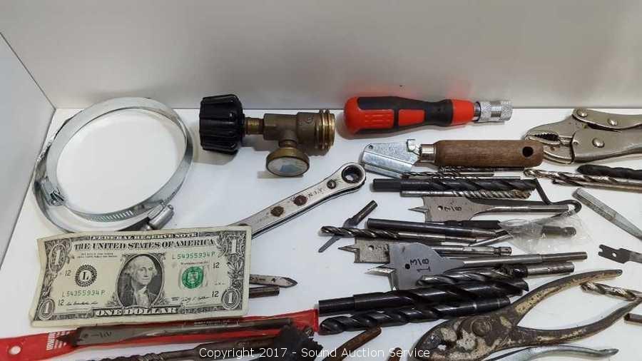 Some vise grips, drill bits of various sizes, pipe clamps, screwdrivers, bottle opener