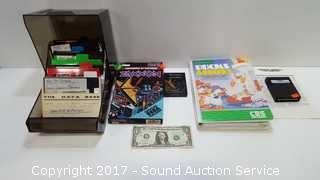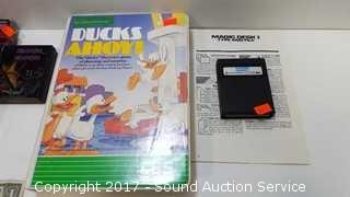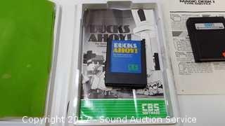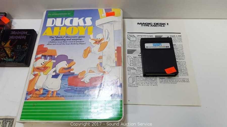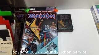 Includes Sega Zaxxon Cartridge game w/ original box and manual, Ducks Ahoy w/ original box and manual, Magic Desk 1 w/ Manual, Ghostbusters, Beach head, Chess, Temple of Apshai, Commodore Business, Commodore Finance, and Computer Science