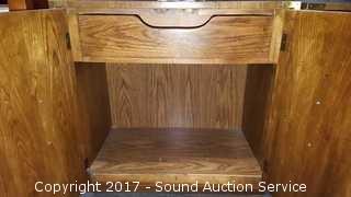 Solid wood, dovetail construction, brass hardware. Approx 30" tall, 30" wide, 18.5" deep.