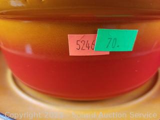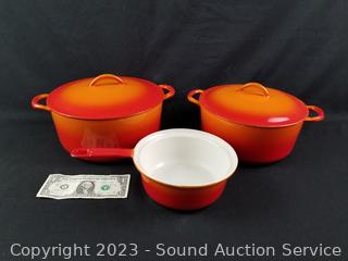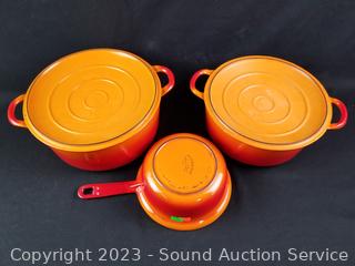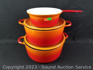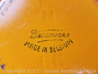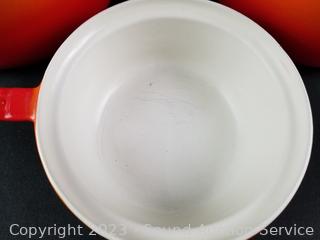 Lot Details: Made in Belgium. 6.5" sauce pan (no lid), 8" & 9" covered casseroles. Some wear from use, overall great condition.