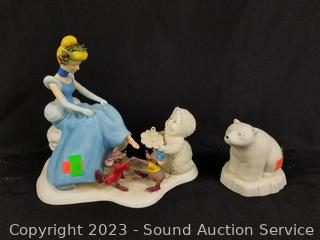 Lot Details: Cinderella, head has broken off, been repaired. Base light has no plug, figures, don't really fit base, one figure has looks like it should fit but doesn't.