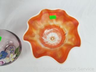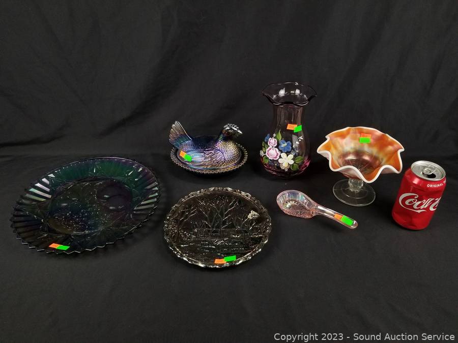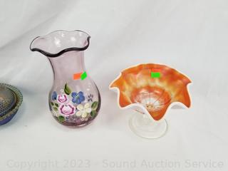 Lot Details: 1pc Marked Fenton, small plate, the hand painted Vase is designed by Fenton. Others unmarked. Don't see any issues. Refer to photos for lot contents.