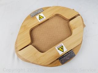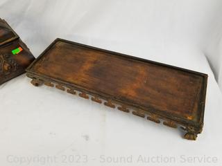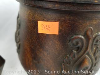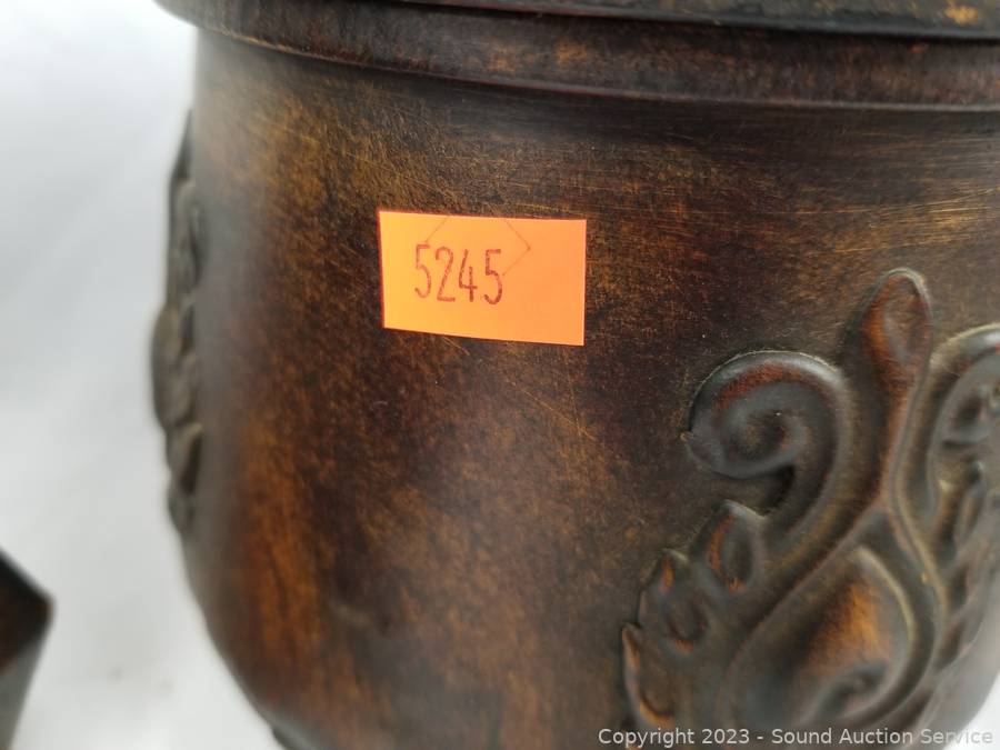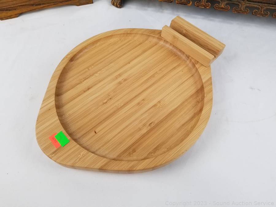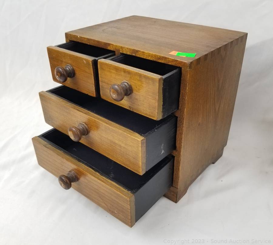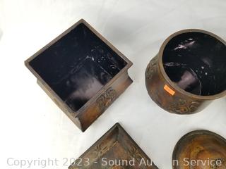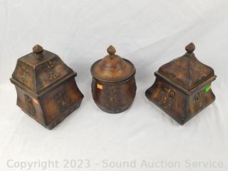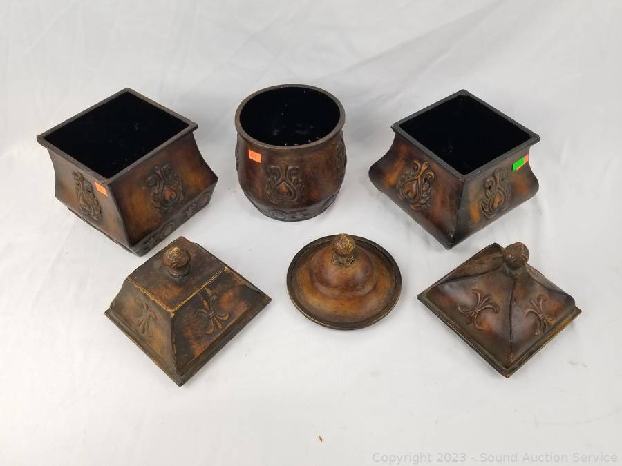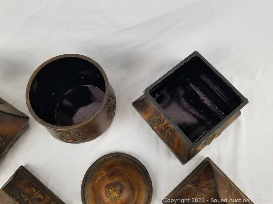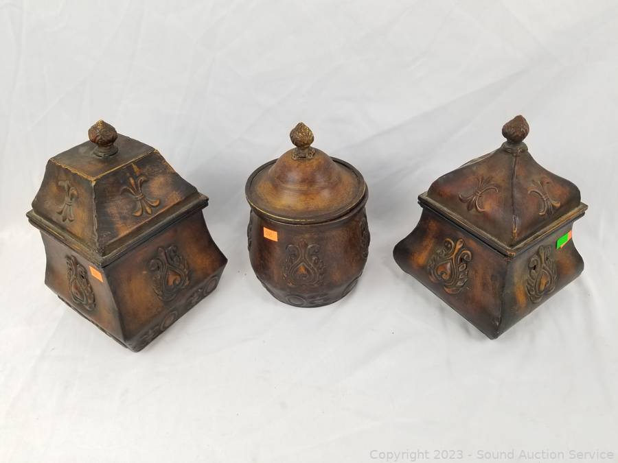 Lot Details: 3pc Decorative Metal Canister Set w/Stand, Small 4 Drawer Chest, Bamboo Cheese Board.