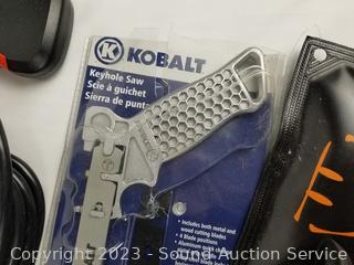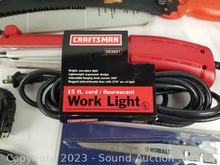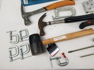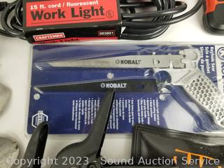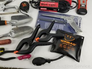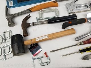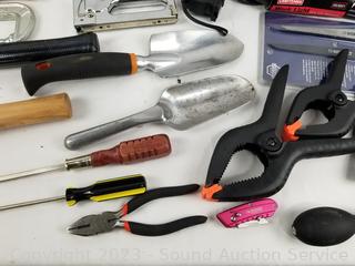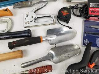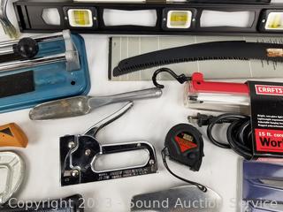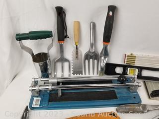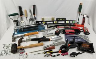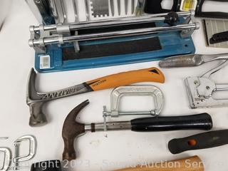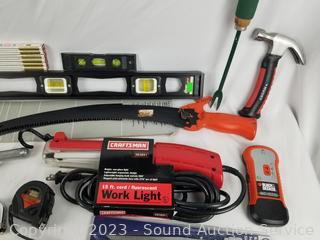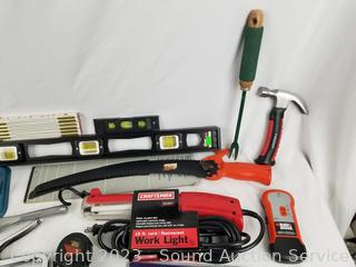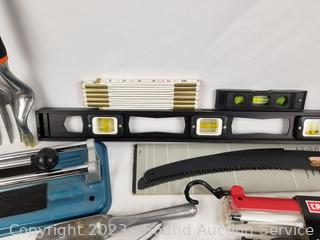 Lot Details: Level, 16" hand saw, 14" tile cutter, work light, gardening tools, Bostitch Antivibe hammer, rubber mallet & more.