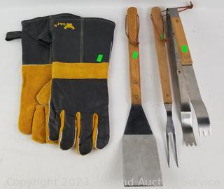 Lot Details: Comes with leather gloves/mitts & BBQ utensil set. 5.5" x 28" x 13.5". Works. Missing knob for thermostat, otherwise In great cosmetic condition.