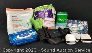 Lot Details: 3 Liotoin Transmitters, receivers all work. Adult Absorbent Underwear S:L, Fleet Saline Enema, Dental Swabs. Comes with clear plastic tote with lid, 10.5" H x 21.5" x 15.5".