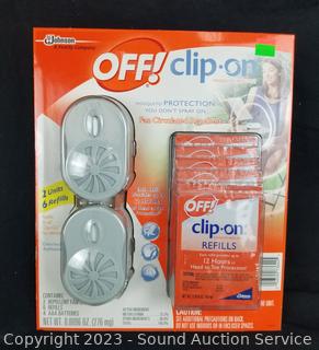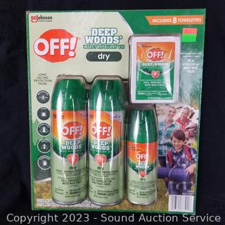 Lot Details: Off Deep Woods & Clip-ons insect repellent, 2.5oz & 6oz sprays, towelettes, 2 clip-ons with refills. All are sealed.