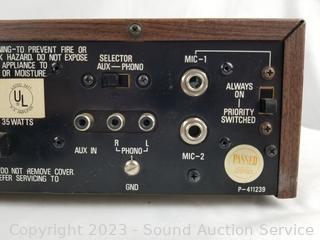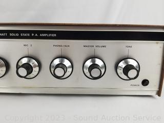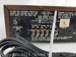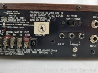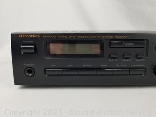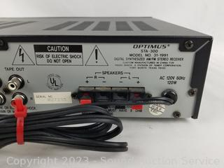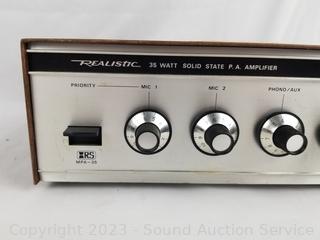 Lot Details: Realistic 35W Solid State P.A. Amplifier MPA-35, has power otherwise untested. Optimus STA-300 Digital Synthesized AM/FM Stereo Receiver, works.