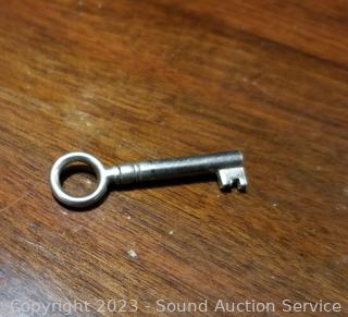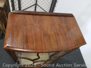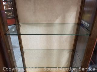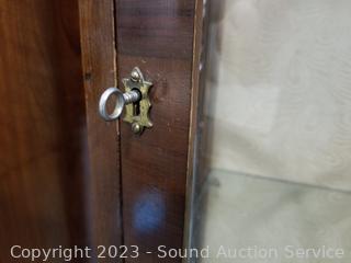 Lot Details: Skeleton key lock with key. 2 glass shelves. Some scuffs & wear to finish. 47" H x 23.5" W x 12.5" D.