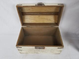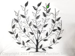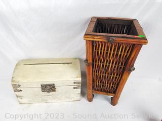 Lot Details: Metal art tree 26" x 25" wall decor, woven wood vessel 17" H x 9" x 9", slit top wood chest 8" x 13" x 7.5", wood centerpiece bowl 26" x 11.5".