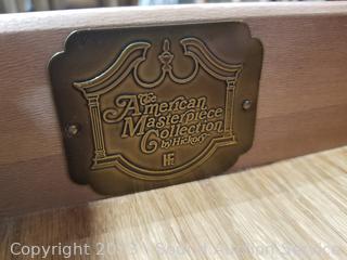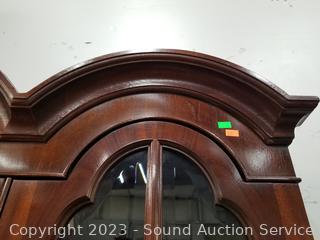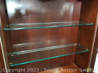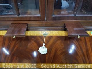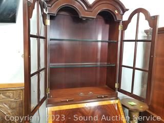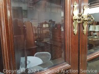 Lot Details: American Masterpiece Collection by Hickory. Skeleton key locks with key. In excellent condition, very well made. Beveled glass panels, contrasting wood finish, brass hardware. 2 piece for easier movement. 84" H x 34" W x 10" to 18" D.