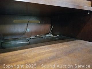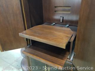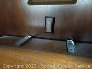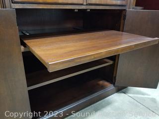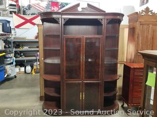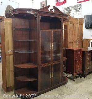 Lot Details: Center cabinet with pull out rack, cord holes in the back, side shelving units, lighted (all lights work), lower cabinet with pull out tray. Very minor wear, great condition. Appears to be solid wood. Comes apart in 3 pieces for easier movement. Overall 87" x 65" x 19.5".