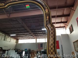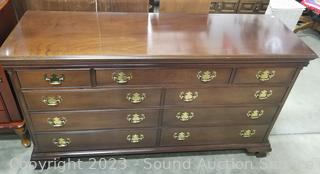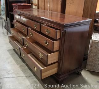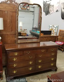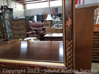 Lot Details: 9-drawers, carved accents, hand painted frame on mirror. Very minor scuffs and scratches, otherwise in excellent condition. Solid wood construction, dovetail joinery. 37" x 65" x 20" with 48" x 33" mirror.