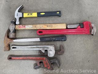 Lot Details: Air paint spray gun, wrenches, hammers, Matco air hammer? (not functioning properly, air passing through), pipe wrenches.