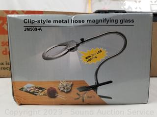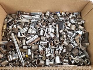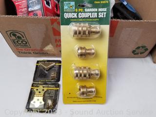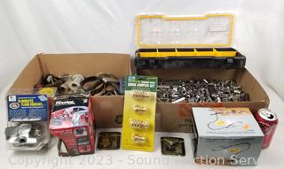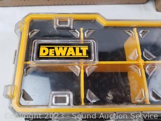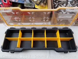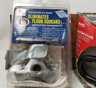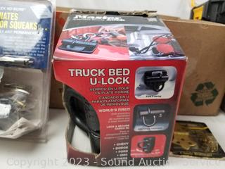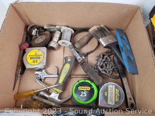 Lot Details: Truck Bed U-Lock, Articulating clamp magnifying glass, torpedo level, tape measures, paint brushes, DeWalt Organizer (2.5" x 6" x 16"), various sockets.