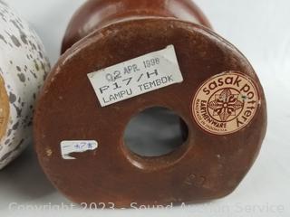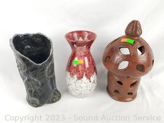Lot Details: Sasak Pottery Candle Lamp, Red Vase marked Made in Italy, other 3 pieces are signed "PPP" & "Ponny". 1.75" to 10.5" H x 4.5" to 7" w/dia.