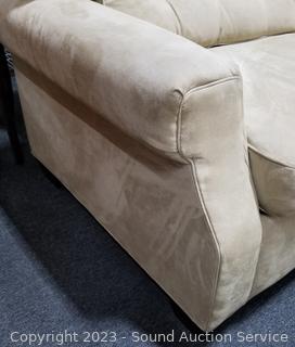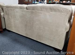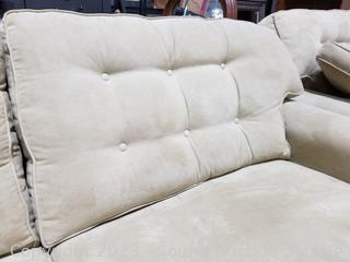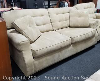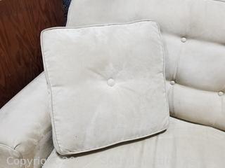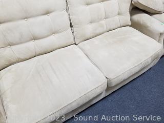 Lot Details: Has a faint cigarette odor. Has a dirty/stain on left facing back top, don't see any other issues. 33" H x 77" W x 20" to seat. Comes with 2 matching throw pillows. Matches the next lot.