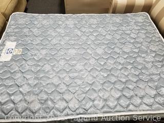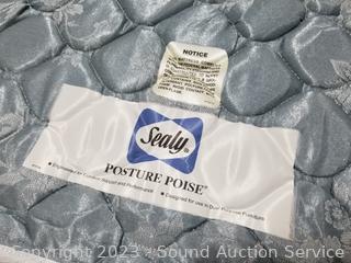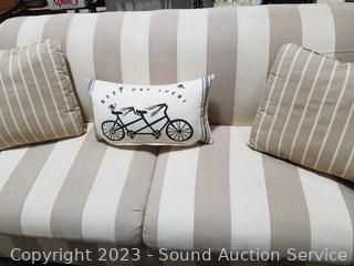 Lot Details: Has a cigarette odor. Several stains in the upholstery, has a musty odor, possibly was stored in a garage. Sealy Posturepedic mattress, don't see any issues with mattress. Comes with 3 matching throw pillows. 33" H x 75" W x 17" to seat.