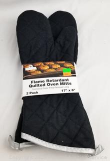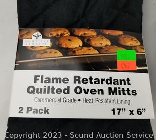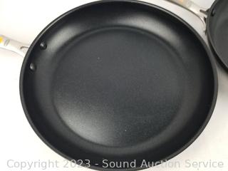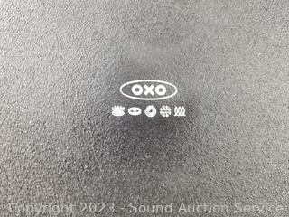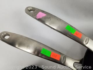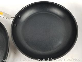 Lot Details: Egg storage container holds 14 eggs, 2 OXO 10.5" & 12" non-stick pans (have some light scratches, scuffs, tape residue on handle), 2pk 17" x 6" oven mitts.
