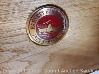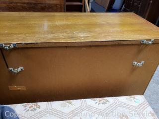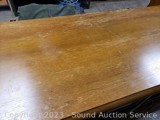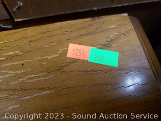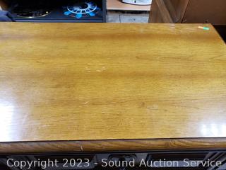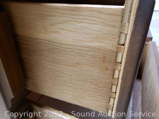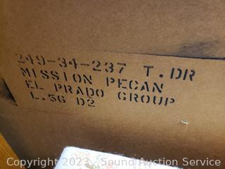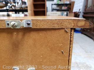 Lot Details: Has a place for a mirror but no mirror. Particle board construction, veneer finish, dovetail joinery. Various wear to finish.