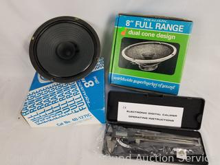 Lot #0163: Electronics Parts/Literature, Speakers & Caliper