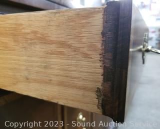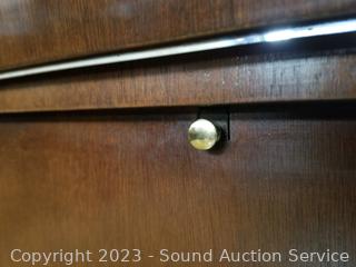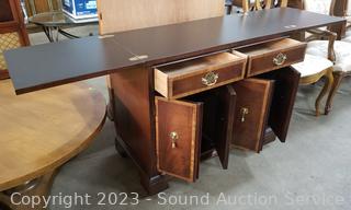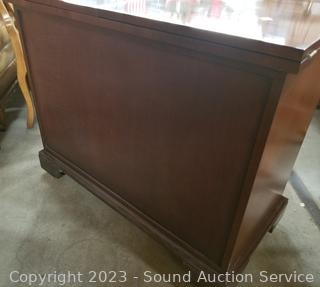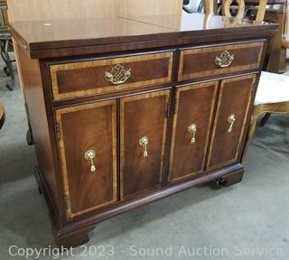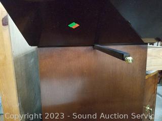 Lot Details: By Hickory. Mahogany finish, appears to be solid wood construction with dovetail joinery. Folding top, opens up to black laminate finish. 31" H x 36" W x 18" D. In excellent condition.