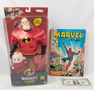 Lot Details: Mr. Incredible & Jack Jack figures are sealed in original packaging. 1973 Marvel Annual book, don't see any major issues.