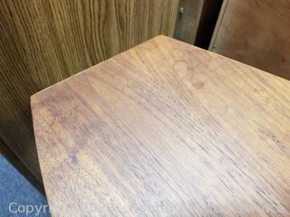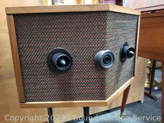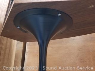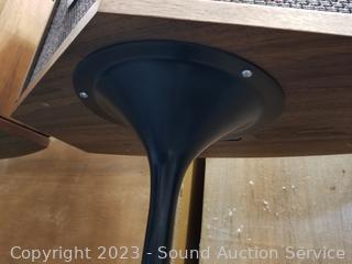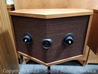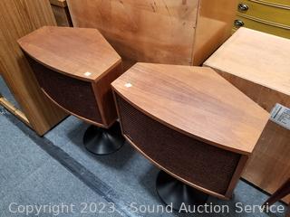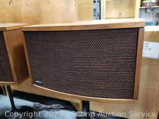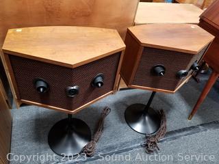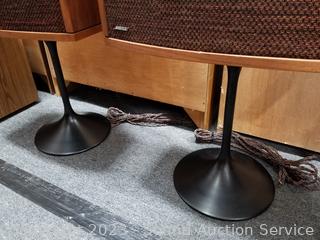Lot Details: Unable to see the model number, believe it is under the stands. Tops have some minor stains, overall in great condition, comes with length of speaker wire for each speaker, ready to hook up. 30" H x 21" W x 13" D.