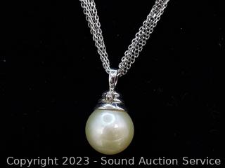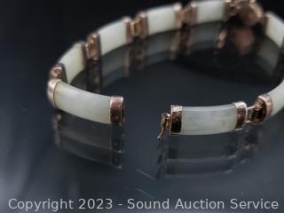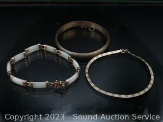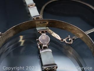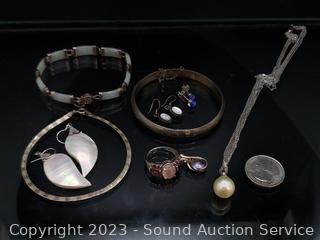 Lot Details: Jade? bracelet is broken, layered necklace has a genuine pearl, ring S:8, TW:46.7g, some non-sterling weight.