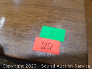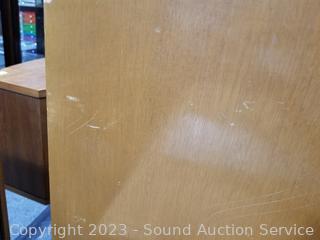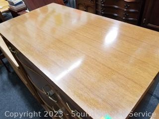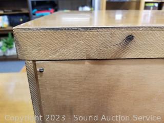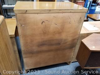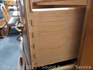 Lot Details: Some minor scuffs, wear to finish. Appears to be solid wood construction, veneer finish, dovetail joinery, brass hardware. Matches the previous lot. 43" H x 34" W x 18" D.