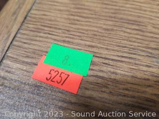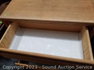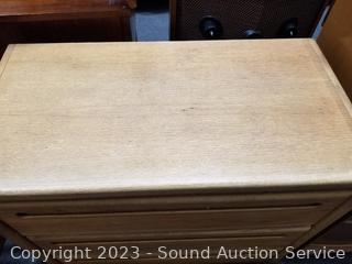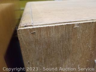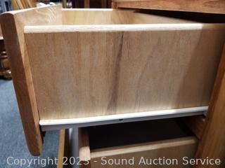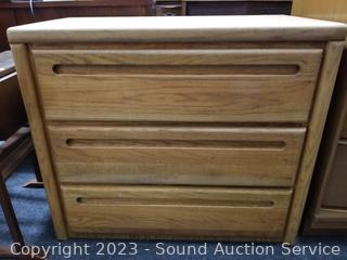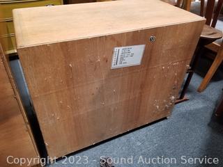 Lot Details: Some wear to finish. Roller drawer guides. Particle board construction, veneer finish. 28" H x 32.5" W x 16.75" D.