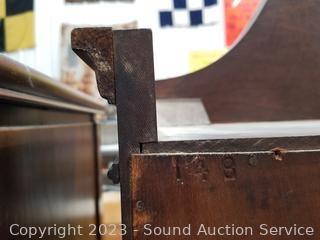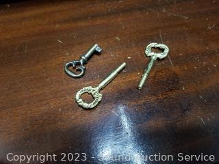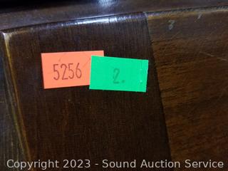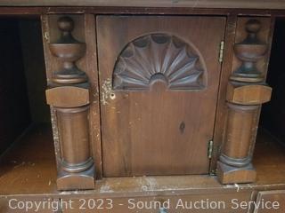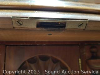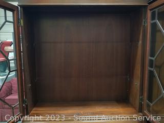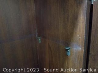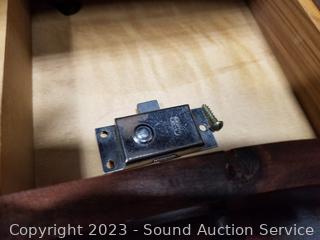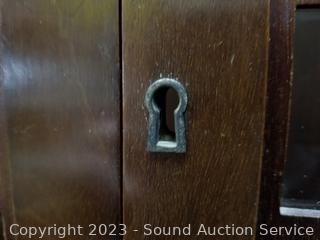 Lot Details: Skeleton key locks with key. Top cabinet lock is not attached believe comes with lock, no shelves for the top cabinet. Some scuffs, dings, wear to finish. 80" H x 33" W x 16" D.