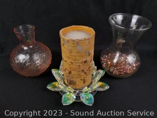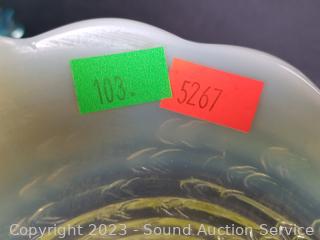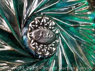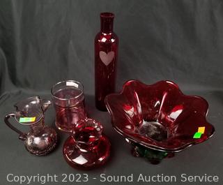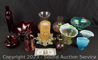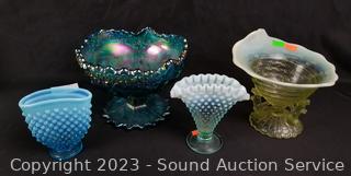 Lot Details: Blue carnival glass compote is marked Fenton. one piece looks to be uranium glass, glows under UV light, ruby, crackle, hobnail glassware. Approx. 3" to 10" tall, 2.25" to 8.5" dia.