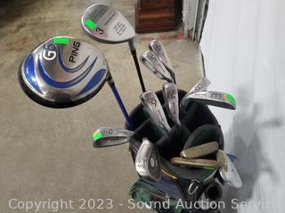 Lot Details: Various brands of clubs, Ping, Spalding, Cleveland, Super Concord, 10.5 degree driver, 3 driver, 3, 4, 5, 6, 7, 9 irons, S & W, putters, some tee's. Various wear from use.