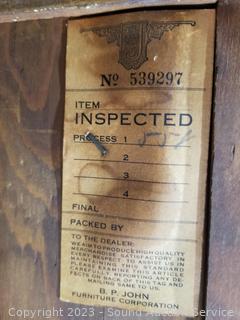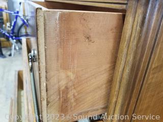 Lot Details: Solid wood construction maple/oak?, some scuffs, wear to finish. 39.5" H x 30" W x 19" D.
