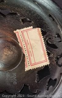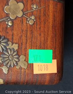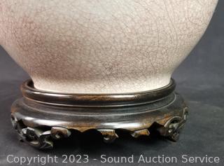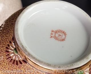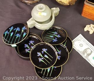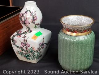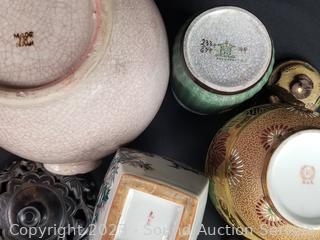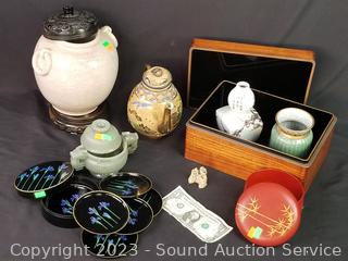 Lot Details: Jade Covered Dish, Copenhagen Denmark crazed vase, enameled coaster set, Japanese vase, hand painted Chinese teapot, wood inlayed enameled interior trinket box (5" x 7.5" x 10.5"), Crazed pottery Japanese pot w/carved wood stand & lid.