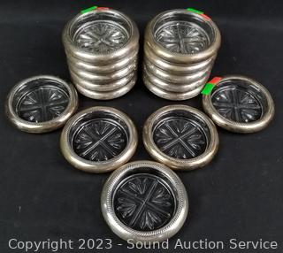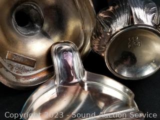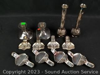 Lot Details: Rogers silver plate trim coaster, sugar dishes, bud vases, lemon wedge juicers, candle holders, small teapot & more.