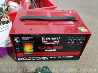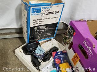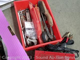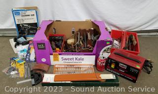 Lot Details: Century 6V & 12V battery charger, soldering gun, tool totes with various hand tools, screwdrivers, wire brush, precision screwdriver set, stud finder, vise grips & more.