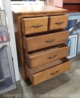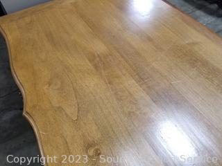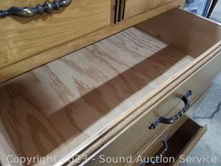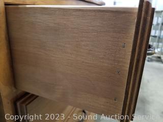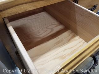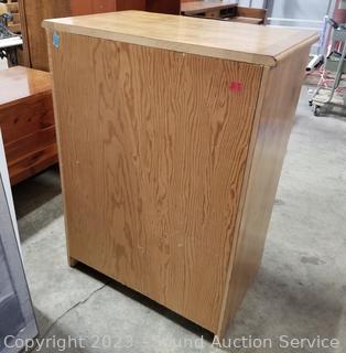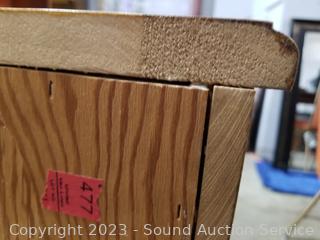 Lot Details: Some scratches on the top, minor scuffs in finish. Solid wood construction. 35" H x 26" W x 17" D.