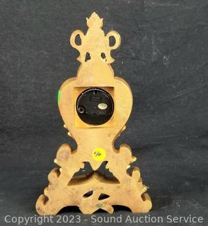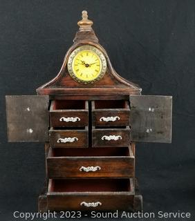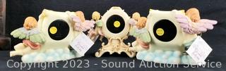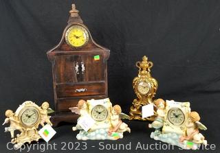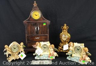 Lot Details: Large clock not functioning, has 6 drawer. No battery for gold clock, 3 cherub clocks all are functioning as intended. 5.5" to 19" H x 6" to 10" W.