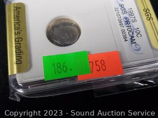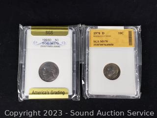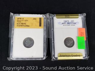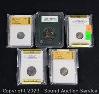 Lot Details: 1986 Liberty Half Dollar PR70, 1993D MS70 5c, 1978D MS70 10c, 1970S PR70 10c, 1997 PR70CAM 10c. ATTN: We are not coin or currency experts or graders, please use your own judgement when bidding.
