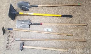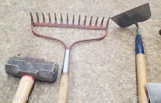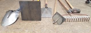 Lot Details: 10x10" tamper, spade & flat head shovels, hoe, 8lb sledgehammer, brush rake.