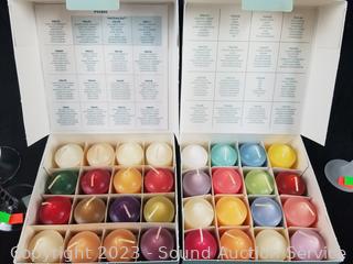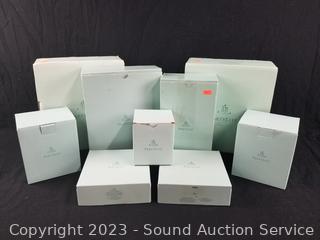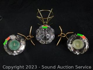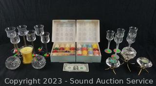 Lot Details: Iced Crystal Stemware Votives, Solitaire Tea Light Holders, Harlequin Votive Holder Set, Trumpet Jar Candle, Amber Votive Holder Set. All come with original boxes.