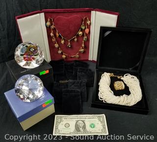 Lot #0144: Designer Necklaces, Pouches & Diamond Paperweights