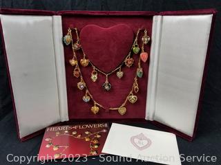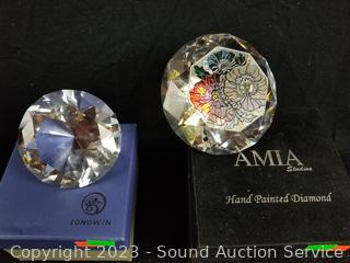 Lot Details: Longwin Crystal Diamond Paperweight, 2" x 3" Dia. Amia Hand Painted Diamond Crystal Paperweight 3" x 4" Dia. Elizabeth Taylor for Avon Evening Star Necklace, Joan Rivers Hearts & Flowers Charm Necklace. All with original boxes.