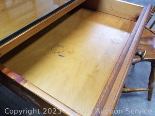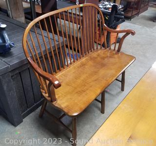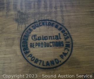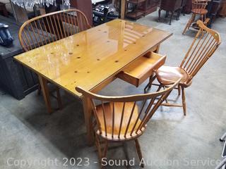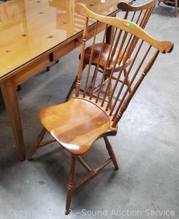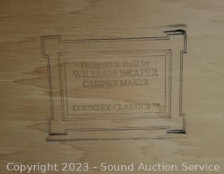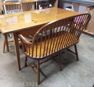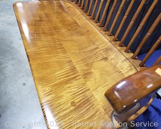 Lot Details: Dining table is designed and built by William Draper Cabinet Maker, comes with protective glass top, single drawer. Frederick Duckloe & Bros. Colonial chairs & bench. In excellent condition, very well made. Do see a few scuffs on seats of chairs.