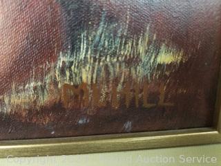 Lot Details: Believe signed Mihill, signed in brown, hard to make out. 19.5" x 23.5". Some scuffs on frame.